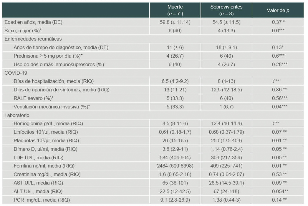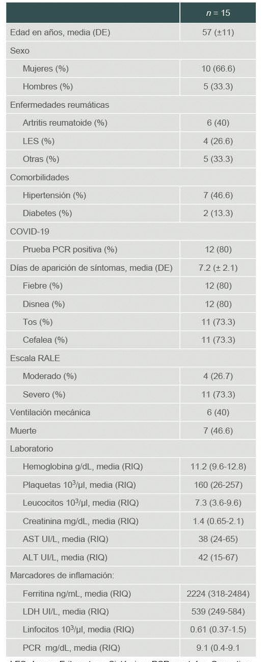 Resultados: se incluyeron 15 pacientes con edad media de 57 años (DE ± 11), el 66.6% eran mujeres, el 80% tuvieron prueba de PCR positiva. El tiempo de inicio de síntomas hasta la hospitalización, en promedio, fue de 7.2 días (DE ± 2.1). Falleció el 46.6%. Los pacientes que murieron tenían un nivel medio de plaquetas más bajo en comparación con los sobrevivientes. Los reactantes inflamatorios fueron más altos en los fallecidos. No hubo diferencias estadísticamente significativas en cuanto a la mortalidad para las variables relacionadas a la enfermedad reumática.