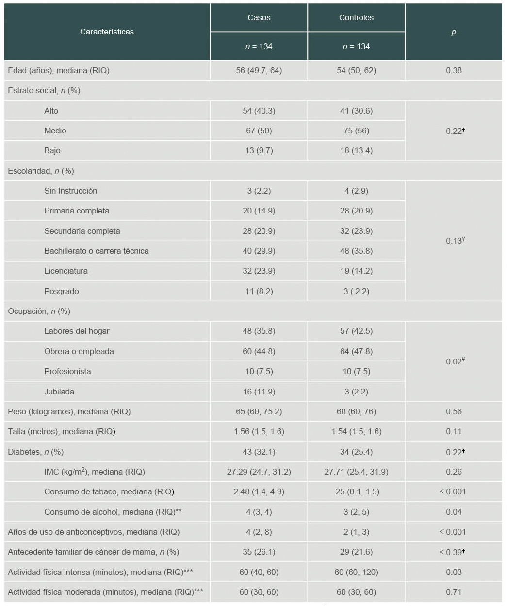 Se estudiaron 134 mujeres en cada grupo del ensayo (casos y controles), la mediana de edad fue 56 años para los casos y 54 años para los controles (p = 0.38), la distribución por nivel socioeconómico y escolaridad no tuvo diferencia significativa entre casos y controles. Respecto a la ocupación, el 44.8% y el 47.8% de los casos y controles, respectivamente, eran empleadas u obreras; hubo una mayor proporción de participantes jubiladas en el grupo de casos (11.9%) y de ocupación del hogar en el grupo de controles (42.5%) (p = 0.02). La mediana del peso fue de 65 kg para los casos y 68 kg para los controles, no existiendo diferencia significativa (p = 0.56). La mediana de la talla fue de 1.56 m para los casos y 1.54 m para los controles, por lo que tampoco se observaron diferencias significativas. De igual manera, tampoco hubieron diferencias significativas entre la proporción de DT2 (32.1 frente a 25.4 [p = 0.22]) y la mediana del IMC entre grupos (27.29 frente a 27.71 [p = 0.26]). Respecto a las variables del estilo de vida, se encontraron diferencias significativas en el consumo de tabaco, consumo de alcohol y actividad física (cuadro I).