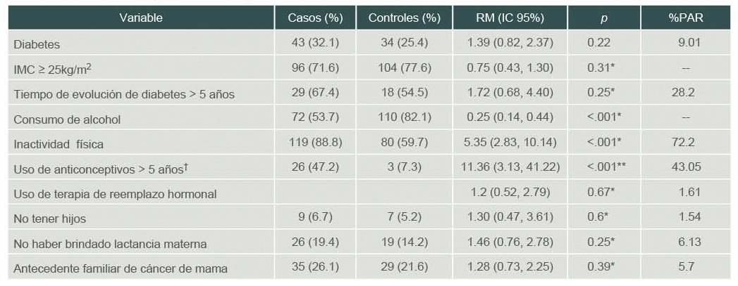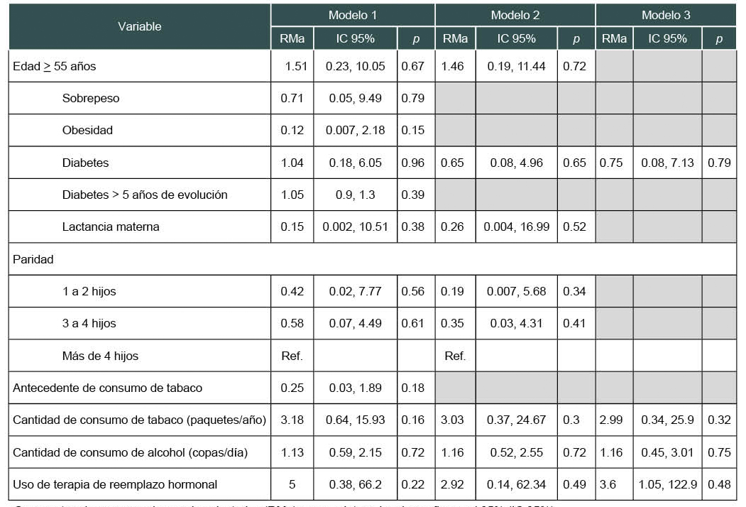Resultados: se incluyeron en total 134 casos y 134 controles. Se identificó un mayor riesgo de CaMa en aquellas mujeres que no realizan actividad física y con el uso de anticonceptivos > 5 años. El uso de terapia de reemplazo hormonal (TRH) se asoció con una razón de momios ajustada (RMa) de 5.0, p = 0.22 en el modelo 1. Conforme se ajustan los modelos, la TRH para el modelo 2 tuvo una RMa de 2.92, p = 0.492 y en el modelo 3 una RMa de 3.6 p = 0.753. La presencia de diabetes se asoció a una RMa de 1.04, p = 0.96 en el modelo 1; RMa de 0.65, p = 0.65 en el modelo 2 y una RMa de 0.75, p = 0.79 en el modelo 3.