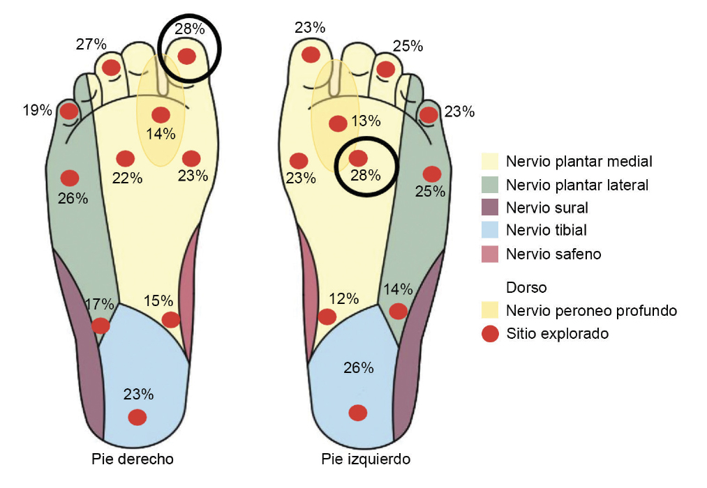 La exploración de sensibilidad profunda con diapasón se encontró anormal en 119 pacientes (86.2%); en la exploración de sensibilidad superficial con MSW se determinó neuropatía en 42 pacientes (30.4%). El punto con insensibilidad más frecuente en el pie derecho fue en el pulpejo del I ortejo, y en el pie izquierdo, a nivel de la cabeza del III metatarsiano, pertenecientes al territorio del nervio plantar medial (figura 1).