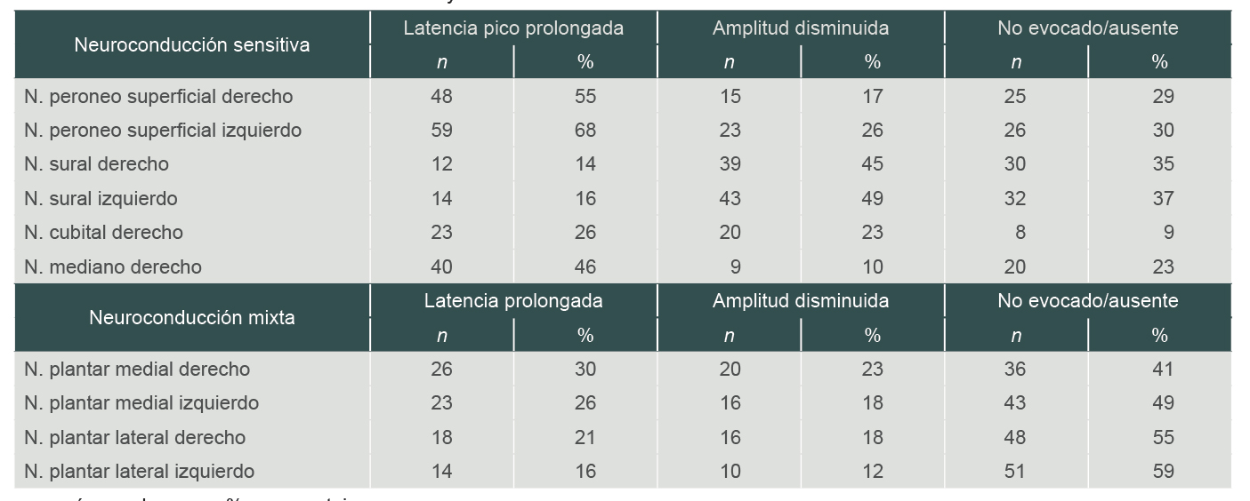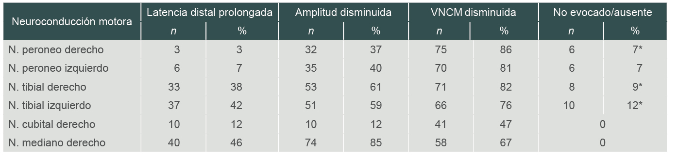 En el estudio de neuroconducción motora, se encontró en el nervio peroneo derecho una latencia distal media de 3.5 ± 1.2 (1.9-11) m/s, amplitud de 4.9 ± 3.9 (0.1-20) mV y velocidad de neuroconducción motora (VCNM) de 43.2 ± 5 (31-52) m/s; en el nervio peroneo izquierdo, una latencia distal de 3.8 ± 1.2 (2.3-11) m/s, amplitud de 4.8 ± 3.7 (0.1-20.1) mV y VNCM de 45.2 ± 6(28-63) m/s; en el nervio tibial derecho, una latencia distal de 4.6 ± 1.5(2.9-14.9) m/s, amplitud de 5.6±4.8 (0.1-19.1) mV y VNCM de 40.9 ± 5.9 (28-59) m/s; en el nervio tibial izquierdo, una latencia distal de 4.5 ± 1.2(3-10.8) m/s, amplitud de 5.8 ± 4.4(0.2-18.5) y VNCM de 40 ± 6.3(25-58) m/s; en el nervio cubital derecho, una latencia distal de 3.1 ± 0.9 (2.2-8) m/s, amplitud de 7.8 ± 2.8 (0.5-16) mV y VNCM de 52.7 ± 9.1(13-72) m/s; en el nervio mediano derecho, una latencia distal de 4.2 ± 1 (2.7-8.9) m/s, amplitud de 5.7 ± 3.4 (0.6-16.3) mV y VNCM de 50.3 ± 6.2 (30-68) m/s. Los valores anormales y respuestas no evocadas se presentan en el cuadro II.