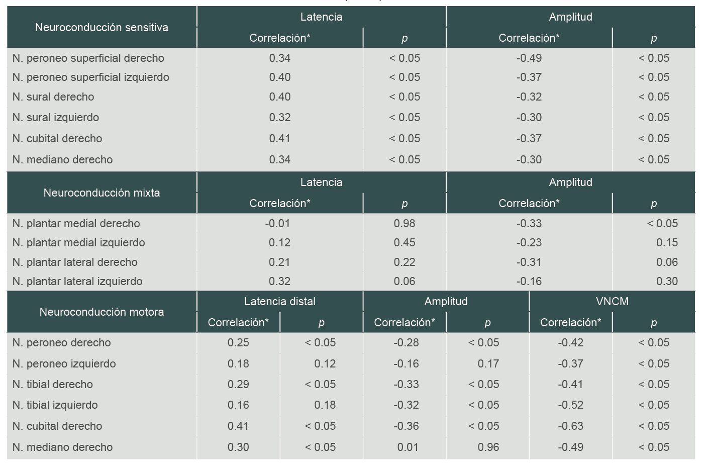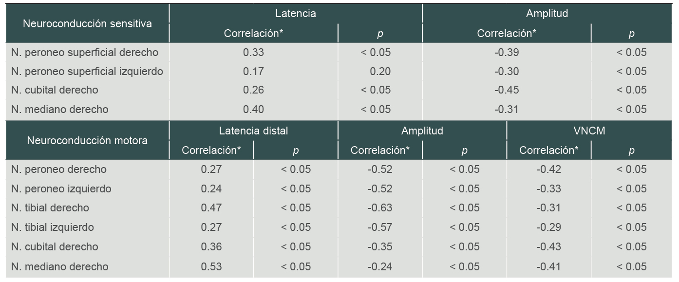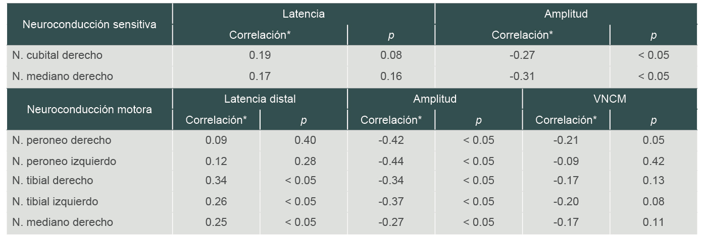 Con la prueba de K-S se obtuvo una distribución de no normalidad, por lo que se realizó correlación de Spearman de las variables de neuroconducción con la edad, encontrando correlación positiva con las variables de latencia y correlación negativa con las variables de amplitud y VNCM (cuadro III). Asimismo, se realizó correlación de Spearman con la variable de años de evolución encontrándose positiva con latencia y negativa con amplitud y VNCM (cuadro IV).