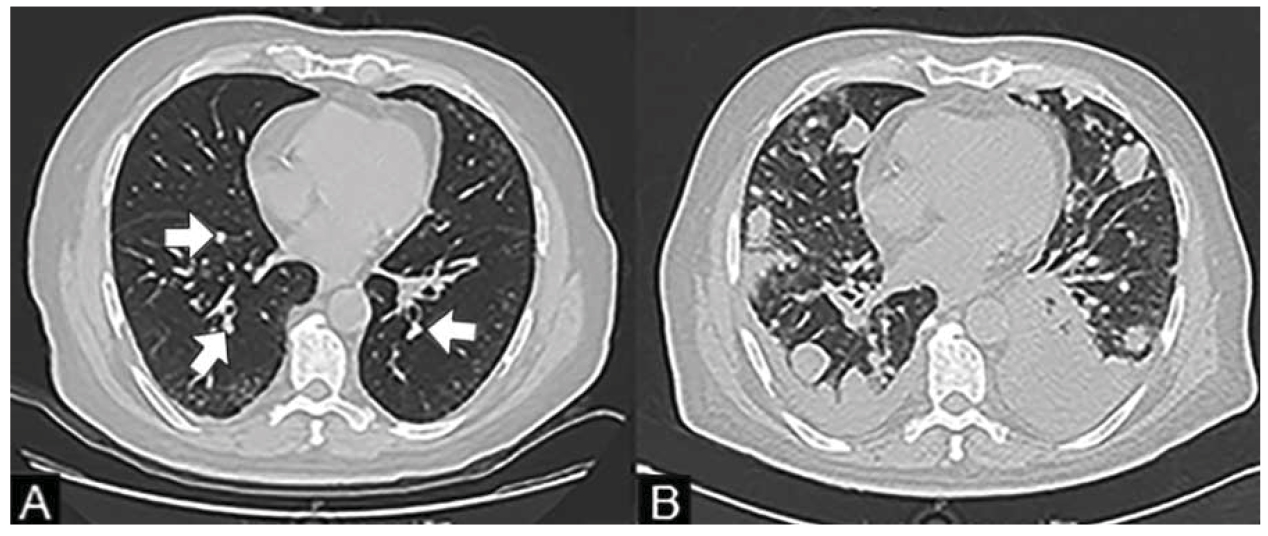 Se solicitó valoración por Oncología médica, quienes refirieron que el paciente no era apto para recibir quimioterapia basada en cisplatino debido a su pobre estado funcional (Eastern Cooperative Oncology Group, ECOG 2). Por la misma razón, el departamento de Urología decidió no realizar una cistectomía radical y en su lugar mantenerlo en vigilancia estrecha, realizando nuevas RTUV según se ameritara como tratamiento paliativo. Dos meses posteriores a la cirugía, nuestro paciente fue hospitalizado debido a infección por COVID-19. La TC de tórax realizada en ese momento reveló derrame pleural bilateral, patrón intersticial y una rápida progresión de la enfermedad metastásica (figura 1B). Lamentablemente, murió debido a complicaciones relacionadas a la infección por COVID-19 y la enfermedad metastásica a los dos meses de realizado el diagnóstico.
