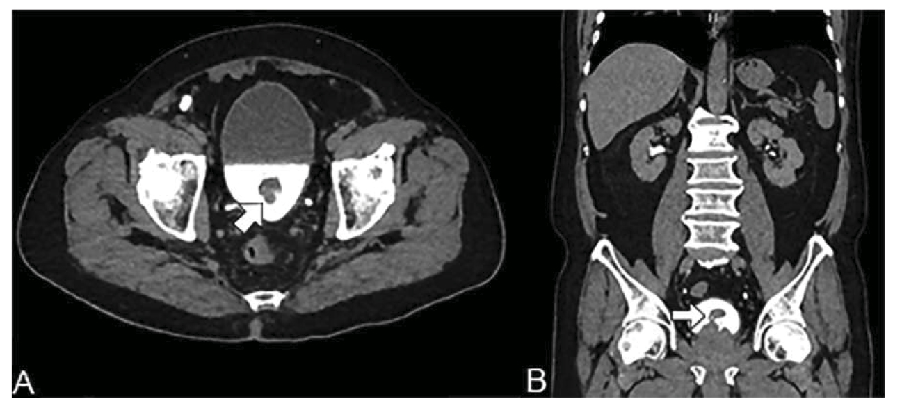 A nivel de vejiga, se observó engrosamiento de la pared posterior con realce hasta las 76 Unidades Hounsfield (UH) en la fase arterial, y un defecto de llenado de 12 mm en la fase de eliminación (figura 2).
