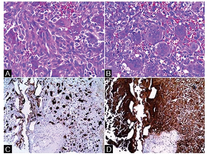 El análisis por Patología de la pieza quirúrgica reveló una composición por dos poblaciones celulares a la tinción con hematoxilina y eosina (H&E): la primera de ellas estaba compuesta por células mononucleares con escaso citoplasma eosinofílico y una morfología en forma de huso, sus características nucleares mostraron cromatina en forma de vesículas y discretos nucleolos (figura 3A); la segunda población estaba compuesta de células gigantes con múltiples núcleos, compatibles con células gigantes parecidas a osteoclasto, con atipias evidentes (figura 3B). Las dos poblaciones celulares se encontraban rodeadas por un estroma altamente vascularizado, con zonas de extravasación eritrocitaria y necrosis extensa.