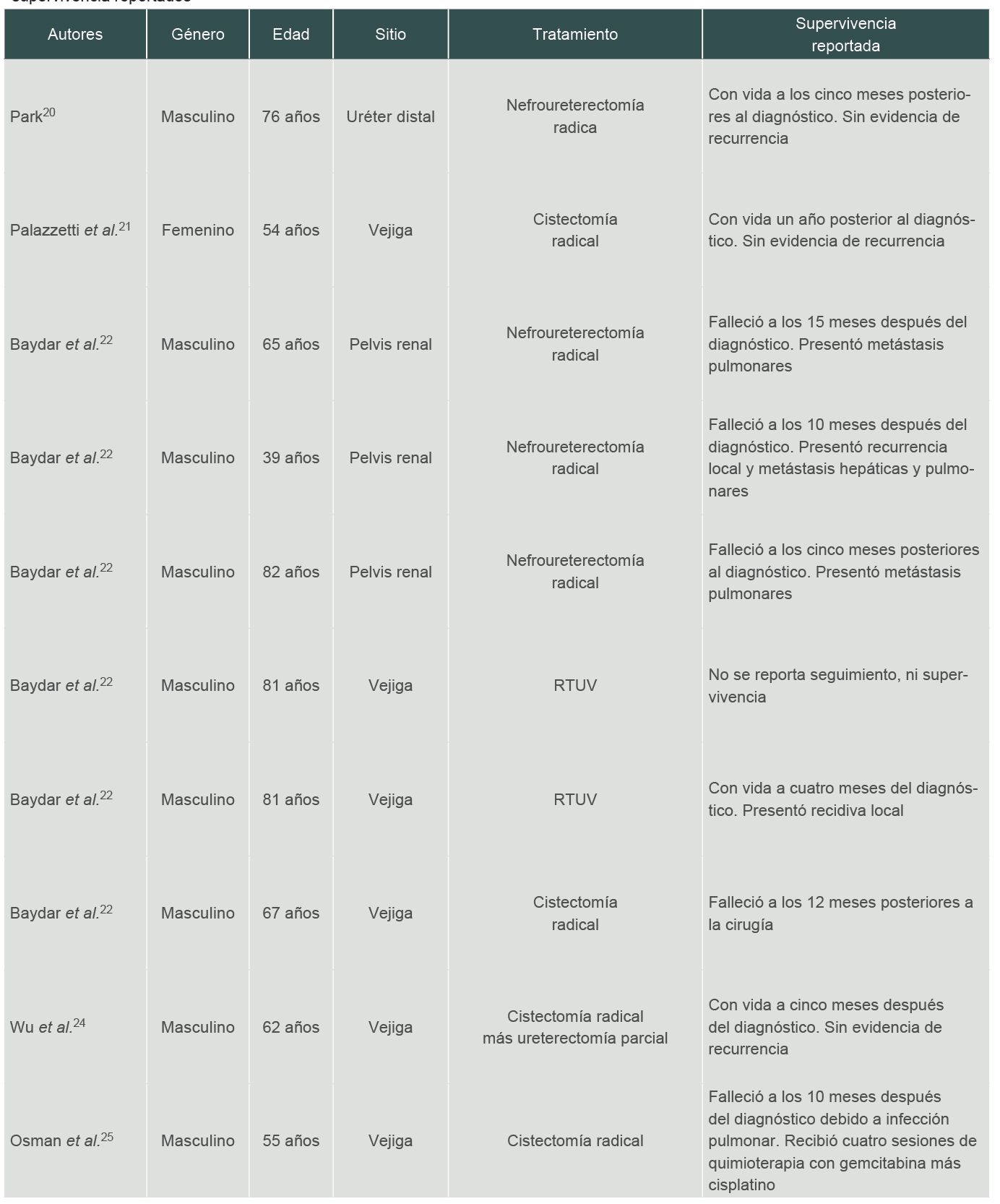 Conclusiones: estos tumores son extremadamente inusuales y agresivos. El único método diagnóstico es a través de inmunohistoquímica en donde se confirme la presencia de marcadores epiteliales para urotelio en las células neoplásicas. Se recomienda un tratamiento quirúrgico radical y a la fecha no existe un tratamiento adyuvante efectivo demostrado. Su supervivencia media global es de 15 meses.
