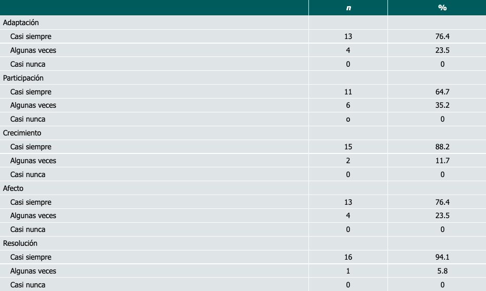 El cuestionario APGAR familiar adaptado para niños de 8 años en adelante arrojó que 16 (94.1%) pacientes tuvieron funcionalidad familiar, 1 (5.8%) disfunción familiar moderada y ninguno (0%) disfunción familiar grave. La resolución fue el aspecto del funcionamiento de la familia que obtuvo el mayor porcentaje de satisfacción, con 16 respuestas «casi siempre» (94.1%). La participación fue el aspecto con el menor porcentaje de satisfacción, con 11 respuestas «casi siempre» (64.7%) (Cuadro I).