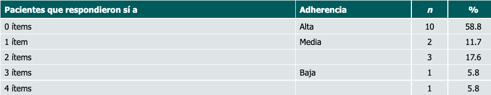 El test de Haynes-Sackett reveló que 12 (70.5%) pacientes fueron adherentes al tratamiento y que 5 (29.4%) no lo fueron. El test de Morisky-Green-Levine, por su parte, encontró adherencia alta al tratamiento en 10 pacientes (58.8%), adherencia media en 5 (29.4%) y adherencia baja en 2 (11.7%) (Cuadro II). Olvidar tomar los medicamentos (41.1%) y dejar de tomar los medicamentos si se siente mal (23.5%) fueron las dos causas principales para no tener adherencia alta al tratamiento antituberculoso.