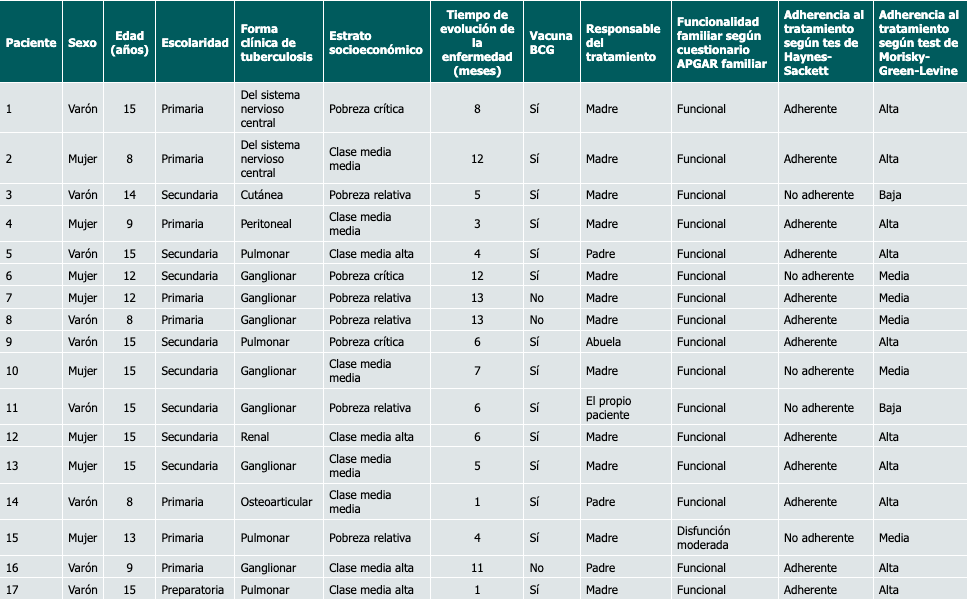 Material y métodos: Estudio transversal descriptivo en el que participaron, de mayo a julio de 2015, 17 pacientes de 8 a 15 años con tuberculosis. Se aplicaron tres instrumentos en español: la dinámica familiar se midió con el cuestionario APGAR familiar adaptado para niños de 8 años en adelante y la adherencia al tratamiento con la prueba de Haynes-Sackett y la prueba de Morisky-Green-Levine.