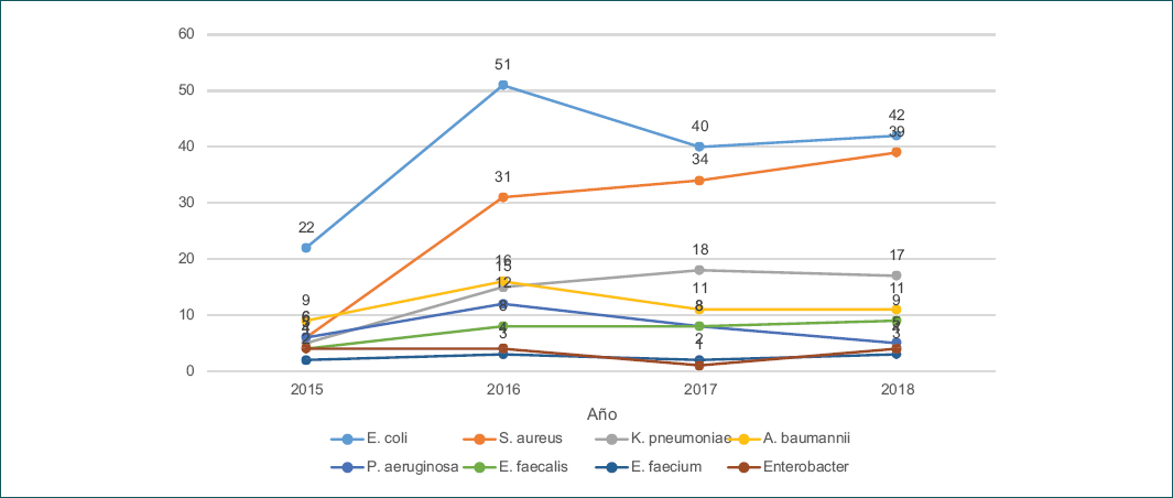 Todos los aislamientos incluidos en este estudio corresponden a casos identificados como IASS. En nuestro hospital, el número promedio de ingresos anuales durante el periodo de estudio fue de 9000, y durante el mismo periodo se registraron 812 episodios de IASS (227 en 2015, 205 en 2016, 203 en 2017 y 177 en 2018), con una tasa anual promedio de IASS correspondiente al 2.2% de los ingresos totales.