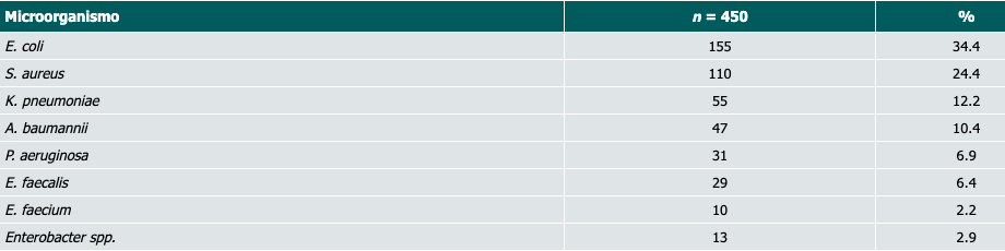 Del total de los microorganismos aislados, se identificó E. coli en 155 (34.4%), S. aureus en 110 (24.4%), K. pneumoniae en 55 (12.2%), A. baumannii en 47 (10.4%), P. aeruginosa en 31 (6.9%), E. faecalis en 29 (6.4%), E. faecium en 10 (2.2%) y Enterobacter en 13 (2.9%) (Cuadro I).