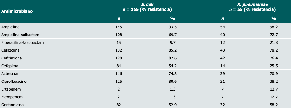 E. coli mostró resistencia a la ampicilina en un 93.5%, a las cefalosporinas de tercera generación en un 82.6% y a las de cuarta generación en un 54.2%; en cuanto a las quinolonas, el porcentaje de resistencia alcanzó el 80.6%. Para los carbapenémicos se evidenció resistencia en el 1.3%.