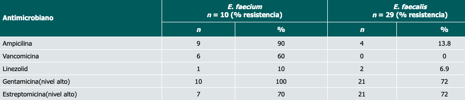 Dentro del grupo de Enterococcus encontramos una notable divergencia en el patrón de resistencia, pues E. faecalis presentó un porcentaje de resistencia a la ampicilina del 13.8% y para linezolid del 6.9%, mientras que E. faecium presentó una resistencia del 90% a la ampicilina y del 60% a la vancomicina, con solo un aislamiento resistente al linezolid. De acuerdo con el reporte de los CDC, E. faecalis y E. faecium mostraban una tasa de resistencia a la vancomicina del 13% y el 83%, respectivamente; en Argentina, Ecuador y Venezuela se observó resistencia a la vancomicina en E. faecalis del 4-9% y en E. faecium del 40-69%.29