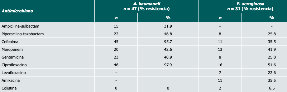 A. baumannii mostró resistencia a la cefepima en el 95.7% de los casos y a los carbapenémicos en el 42.6%. P. aeruginosa mostró resistencia a piperacilina-tazobactam en el 25.8%, a la cefepima en el 35.5% y a los carbapenémicos en el 41.9% (Cuadro IV).