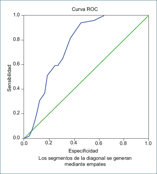 Se realizó una curva ROC tomando como referencia las calificaciones de la RESI-M (promedio más una desviación estándar) obtenidas contra el resultado de la primera evaluación de la CD-RISC-10. El área bajo la curva fue de 0.762, con una significación > 0.001, y tuvo como propuesta un punto de corte de 29 con una sensibilidad del 81.6% y una especificidad del 62.5% (Fig. 1).