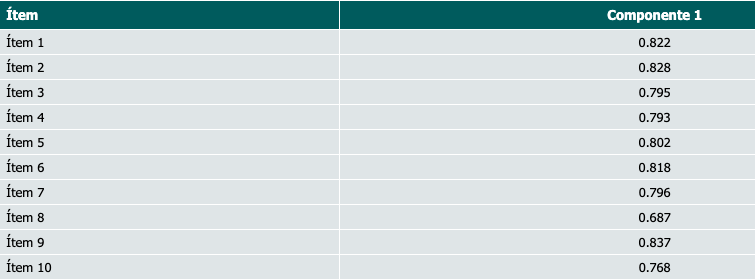 La validación en población mexicana se realizó en 1333 sujetos (31.5% hombres y 67.5% mujeres), con una media de edad de 18.23 años (desviación estándar: 1.4 años; rango: 17-39 años). La consistencia interna de la prueba mostró un alfa de Cronbach de 0.935. Se realizó una prueba de adecuación muestral de Kaiser-Meyer-Olkin, la cual indicó que los datos eran adecuados para hacer un análisis factorial y no fue significativa (p = 0.946), además de una prueba de esfericidad de Bartlett, que presentó una chi cuadrada de 8699.780 p = 0.000), con la cual se observó que los datos formaban una configuración esférica. Con ello se hizo un análisis factorial que mostró un solo factor (Cuadro I).