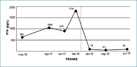 La paciente evolucionó de manera satisfactoria, con disminución de los valores de PTH, retiro de sondas mediastinales, deambulación y adecuadas condiciones para ser egresada al sexto día de la cirugía. En seguimiento a 18 meses del procedimiento con valores normales de PTH, la paciente ingresó a protocolo de trasplante renal y está a la espera de donador.