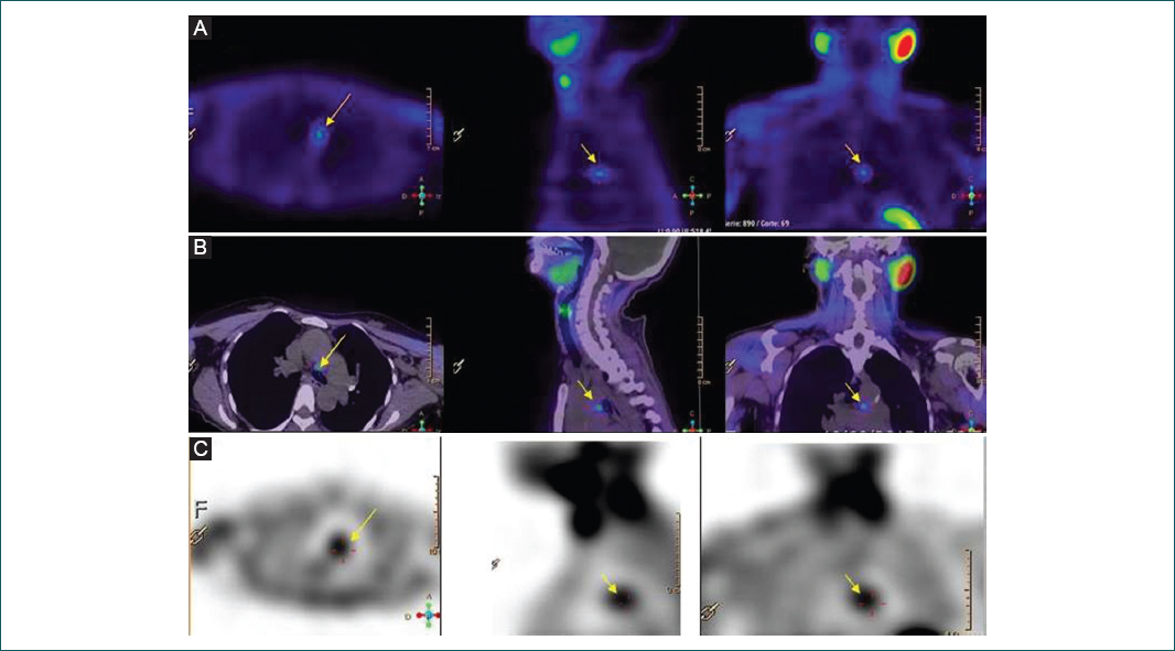 En pacientes con HPS persistente o recurrente posterior a paratiroidectomía total con autotransplante es difícil localizar la fuente del exceso de hormona. En años recientes, las mejoras en el campo de la imagenología han permitido un abordaje quirúrgico con mayor precisión. Las técnicas de imagen más utilizadas son el ultrasonido y la gammagrafía MIBI, en general realizada como SPECT. El ultrasonido es un método no invasivo, de bajo costo y relativamente sencillo. La gammagrafía puede hacerse utilizando diferentes protocolos, usualmente en regiones ricas en bocio, con un protocolo de sustracción con pertecnetato o I123 simultáneo a un escaneo con sestamibi.15 De igual manera, la SPECT puede realizarse con distintos isótopos o incluso con contraste. La localización ectópica de la paratiroides en el mediastino puede ser un reto, tanto en el ámbito clínico como en el quirúrgico.4