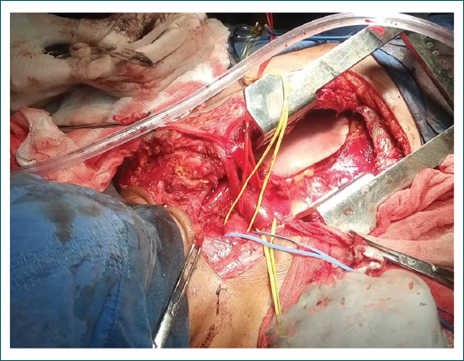 La paciente se mantuvo con manejo médico para el hiperparatiroidismo desde 2014, sin obtener adecuada respuesta, y posterior seguimiento para valorar su ingreso a protocolo de nuevo trasplante renal. Persistió con elevación de la hormona paratiroidea (PTH), con valores de hasta 1731 pg/l (Fig. 1), así como evidencia por tomografía computarizada por emisión de fotón único (SPECT) con 99Tc-MIBI que mostró una imagen hipercaptante en el mediastino relacionada con paratiroides ectópica (Fig. 2). Se decidió un abordaje electivo con esternotomía tipo Trap Door (Fig. 3) y se resecó una lesión de aproximadamente 3 × 2 cm, fija a la raíz aórtica (Figs. 4A y B), que se envió a estudio transoperatorio, el cual confirmó que se trataba de tejido paratiroideo y concluyó definitivamente la presencia de una glándula paratiroides hiperplásica.