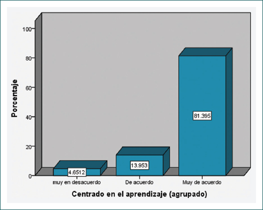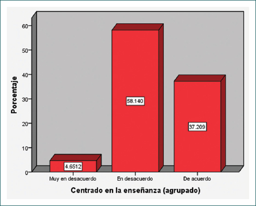 Se incluyeron 43 profesores entre septiembre de 2017 y mayo de 2018. Más de la mitad eran hombres (54%), con una edad media de 40.84 ± 6.7 años y una media de 5 años de actividad como docente. La mayoría (65%) provenían de hospitales generales de zona (HGZ). Las especialidades fueron muy variadas, pero predominaron urgencias y medicina familiar (Cuadro I). En cuanto a la postura de los profesores, la mayoría estuvo en desacuerdo con la educación centrada en la enseñanza (predominio del desacuerdo), mientras que la educación centrada en el aprendizaje tuvo un acuerdo alto (predominó el muy de acuerdo) (Figs. 1 y 2).