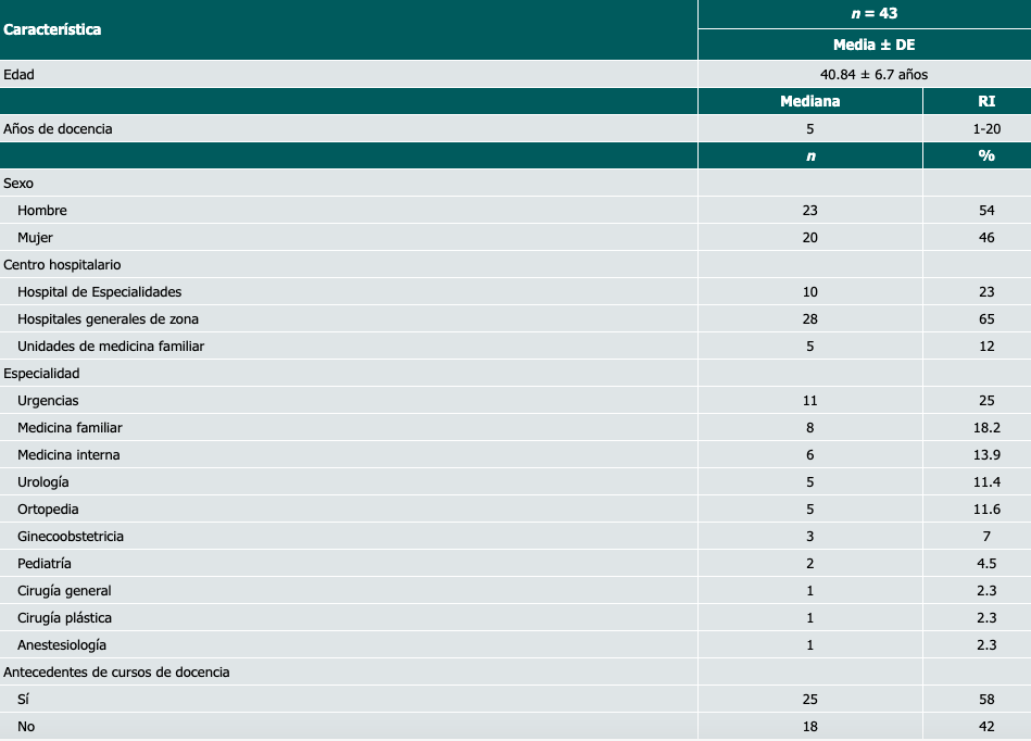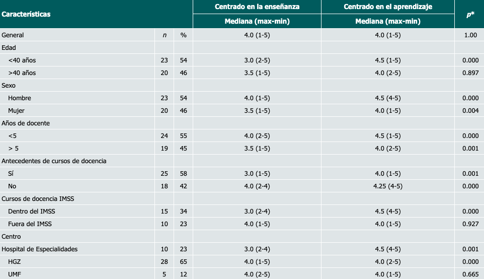Resultados: Se incluyeron 43 profesores con una edad promedio de 40.84 ± 6.7 años. El 65% provenía de hospitales generales de zona (HGZ). La mayoría estuvo en desacuerdo con la educación centrada en la enseñanza, mientras que la educación centrada en el aprendizaje tuvo un acuerdo alto, pero al comparar las medianas no hubo diferencia significativa. Sí hubo una clara diferencia significativa en el perfil centrado en el aprendizaje en cuanto a los menores de 40 años, así como en antecedentes docentes, en especial dentro del Instituto Mexicano del Seguro Social (IMSS) (p = 0.000) y más específicamente en el Hospital de Especialidades del CMN SXXI (p = 0.001) y en los HGZ (p = 0.000).