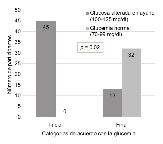 Para medir el impacto de la estrategia se realizó un análisis de los resultados de la glucosa en la evaluación después de la intervención (mes 6) y se identificó que 32 de los 45 participantes (71.1%) tuvieron una glucemia de ayuno en valores dentro del rango de la normalidad (Fig. 1).
