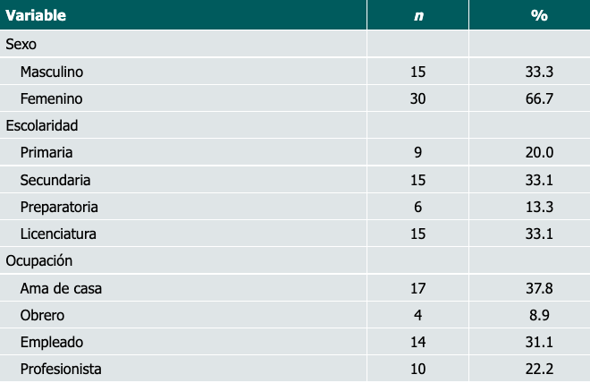 La muestra estuvo constituida por 45 pacientes con diagnóstico de prediabetes y con una edad promedio de 45.2 ± 7.3 años. La mayoría eran mujeres con escolaridad básica y, en cuanto a su ocupación, amas de casa (Cuadro I).