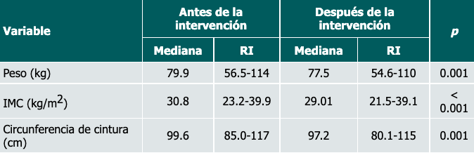 Resultados: Fueron 45 pacientes, con un 66.7% de mujeres. Los parámetros previos y posteriores a la intervención fueron los siguientes, respectivamente: peso (kg), 79.9 (56.5-114) y 77.5 (54.6-110) (p = 0.001); índice de masa corporal (kg/m.), 30.89 (23.2-39.9) y 29.0 (21.5-39.1) (p < 0.001); glucosa (mg/dl), 111 ± 6.3 y 95.8 ± 9.2 (p < 0.001); y colesterol total (mg/dl), 171 (120-223) y 170 (90-205) (p = 0.01).