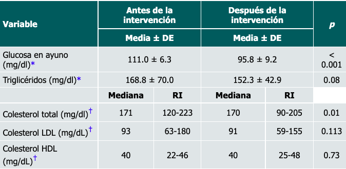 Respecto a los parámetros bioquímicos, hubo una reducción en todos y fue más notoria en los valores de glucosa, colesterol total y triglicéridos respecto a la medición inicial del estudio (Cuadro III).
