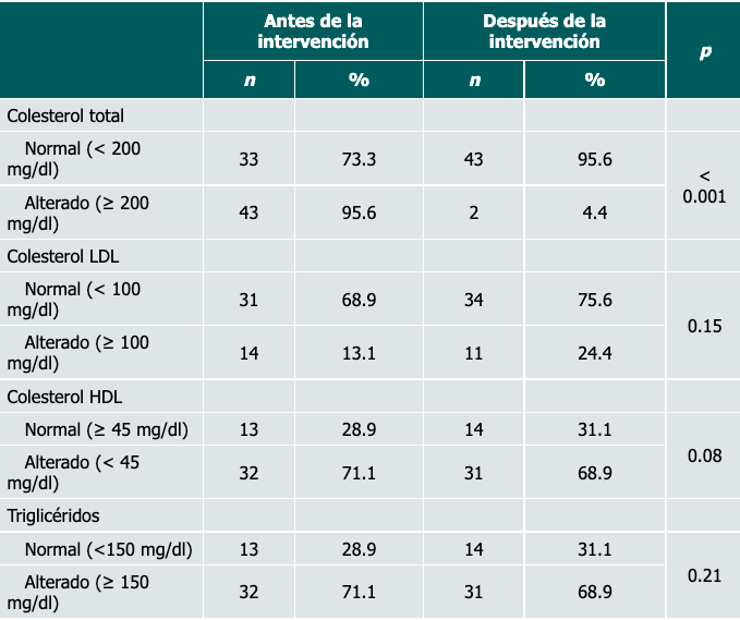 La actividad física se asocia con un aumento del colesterol HDL debido a que modula los lípidos plasmáticos.33 Sin embargo, en nuestro estudio no se encontraron diferencias (antes y después de la intervención) en este parámetro, quizás porque no se determinó el estilo de vida de los participantes y se ha demostrado que existe una asociación entre valores bajos de HDL y estilos de vida no saludables, como estrés, mala nutrición o ciclos de sueño inapropiados, entre otros.34