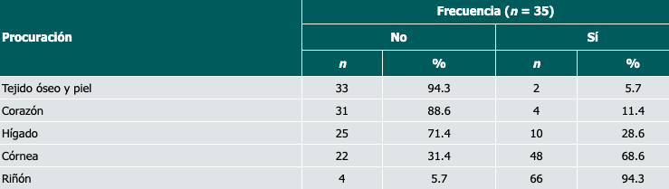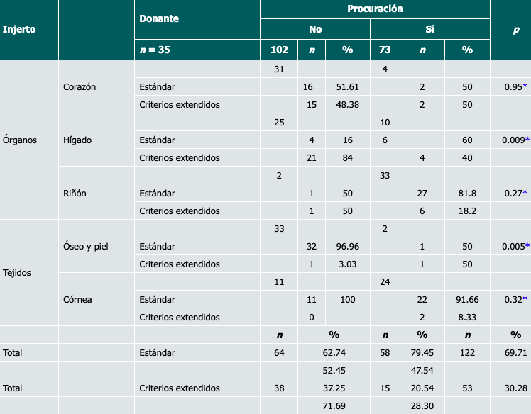 En este estudio se analizaron 35 casos de candidatos a procuración de órganos, de los cuales 18 cumplieron con los criterios internacionales de donante estándar y 17 con criterios extendidos para corazón, pero finalmente solo dos de cada grupo fueron procurados. Respecto a la donación de hígado, 10 se originaron de donante estándar y 25 de donante con criterios extendidos; solo 10 fueron procurados, en mayor proporción de donante estándar. De 35 donantes de riñón, 7 cumplieron con criterios extendidos y 28 estándar; solo no se procuraron aquellos con alteración anatómica macroscópica. De 35 córneas, 24 fueron procuradas, 22 de ellas de donante estándar. El tejido óseo y la piel fueron los menos procurados: de 35 candidatos, 33 (94.3%) no se tomaron a pesar de que dichos tejidos cumplían con los criterios.11 La procuración de cada donación de tejido óseo y piel podría beneficiar alrededor de 20 receptores;12 sin embargo, nuestra experiencia continúa siendo baja.