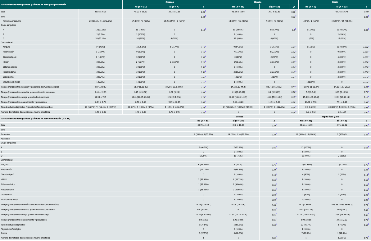 La muestra estuvo conformada por 20 mujeres (57.1%) y 15 hombres (42.9%), con una edad media de 43.8 ± 16.4 años. Las causas de defunción fueron etiología vascular en 23 (65.7%), neoplasia primaria de sistema nervioso central en 11 (31.6%), y anóxica 1 (2.9%). En cuanto a comorbilidad, 14 (40%) no presentaban ninguna, 9 (25.9%) tenían hipertensión arterial sistémica, 2 (5.7%) preeclampsia, 5 (14.3%) diabetes mellitus tipo 2, 3 (8.6%) síndrome HELLP (hemolysis, elevated liver enzymes, low platelet count), 3 (8.6%) etilismo crónico, 3 (8.6%) hipotiroidismo, 2 (5.7%) dislipidemia, 1 (2.9%) acretismo placentario y 1 (2.9%) insuficiencia mitral. En el cuadro III se detalla la cantidad total de órganos y tejidos que sí fueron procurados y los que no.