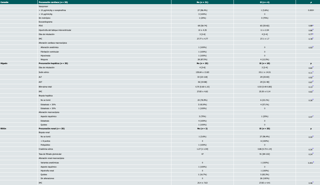 Method: Retrospective cohort, univariate and multivariate analysis. 35 donation files with brain death were included from 2014 to 2019. Groups in which the heart wasn’t procured versus those in which it was procured were compared; same comparisons were made for liver, kidney, skin, bone tissue and corneas.