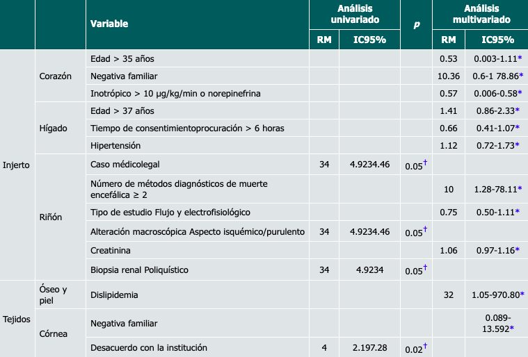 El constante aumento de la diferencia entre la oferta y la demanda sustenta el empleo de donantes con criterios extendidos;1 sin embargo, no todos los injertos que cumplen con criterios estándar se procuran.3 Se ha reportado que en donantes óptimos la probabilidad de concretar la donación aumenta cuatro veces si no existen errores durante el proceso.4 Es importante detectar los factores asociados que tienen impacto en la no procuración de corazón, hígado, riñones, tejido óseo y piel para evitar la pérdida de injertos viables.