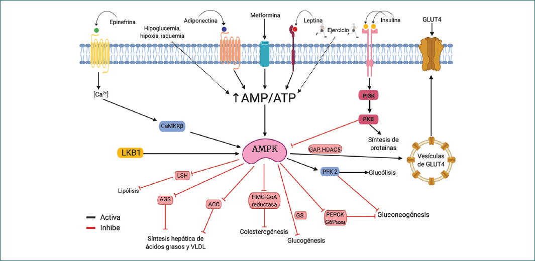 Abstract: The AMP-activated kinase (AMPK) is an important enzyme involved in the regulation of cell metabolism, whose activity is regulated by several mechanisms, mainly the increased concentration of AMP. This enzyme catalyze the phosphorylation of several regulatory proteins implicated in the metabolism of lipids and carbohydrates, upregulating their catabolism. Thus, the AMPK plays an important role in the pathophysiology of some diseases, such as metabolic syndrome and type 2 diabetes mellitus, which have a high prevalence among Mexican population. Because of this, the AMPK has become a relevant target for several drugs used in the management of these pathologies, e.g. metformin and pioglitazone.