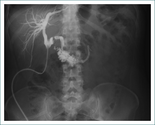 Se llevó a cabo colangiografía por sonda en T con presencia de sonda en el conducto biliar común, permeable, deformación de la vía biliar extrahepática por angulación, con defecto de llenado compatible con lito; hubo flujo de material de contraste y migración de la prótesis, ambos hacia el duodeno (Fig. 1).