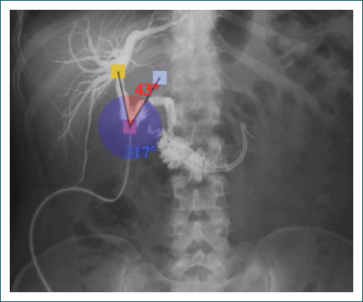 Kim et al.19 reportaron que una longitud menor de 36 mm de la rama distal de la sonda en T y una angulación distal del colédoco ≤ 135° fueron los factores que más contribuyeron a la dificultad en la remoción endoscópica de los cálculos de la vía biliar común.