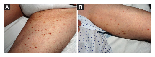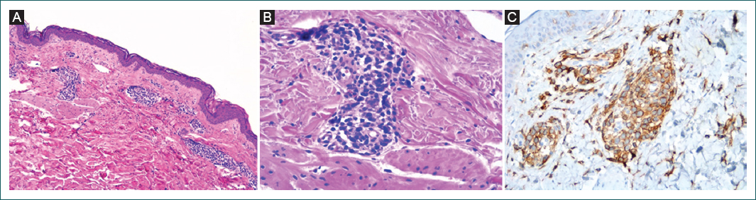 Varón de 79 años sin antecedentes de interés, diagnosticado de LPL-T tras el hallazgo incidental de linfocitosis en sangre periférica a expensas de linfocitos T CD4+. La población de linfocitos T expandida presentaba un perfil inmunofenotípico CD2, CD3, CD4, CD5 y CD7 positivos, y CD8, CD25 y CD11b negativos. Los marcadores inmunofenotípicos de leucemia de linfocitos grandes granulares (CD56 y CD57) fueron negativos. Se realizó una biopsia de médula ósea que mostró un infiltrado del 78% de linfocitos atípicos inmunofenotípicamente idénticos a los observados en sangre periférica, lo que confirmó el diagnóstico de LPL-T. El reordenamiento de genes TCR (T-cell receptor) en sangre periférica fue oligoclonal, y en médula ósea fue biclonal. La serología para virus linfotrópico humano de células T (HTLV) tipos 1 y 2 negativa descartó una leucemia linfoma de células T del adulto. En las pruebas de imagen no se detectaron adenopatías ni hepatoesplenomegalia. Tras la duplicación de los valores linfocitarios a los 6 meses, el paciente inició tratamiento con alemtuzumab y consiguió la remisión completa evaluada mediante citometría de flujo y TCR en sangre periférica y médula ósea. Tras varias recaídas y cinco nuevos ciclos de tratamiento con alemtuzumab realizados a lo largo de 3 años, comenzó a desarrollar complicaciones infecciosas respiratorias que obligaron a suspender el alemtuzumab. Tres meses después comenzaron a aparecer lesiones maculopapulosas eritematopurpúricas distribuidas de forma simétrica en la cara interna y la raíz de las extremidades superiores e inferiores (Fig. 1 A y B). En la biopsia cutánea se objetivó un infiltrado perivascular de linfocitos con citoplasmas escasos y núcleos pleomorfos, basófilos, con inmunohistoquímica positiva para CD2, CD3, CD4 y CD5, compatible con infiltración por su enfermedad de base (Fig. 2 A-C). Ante la evidencia de recidiva de la enfermedad se inició tratamiento con bendamustina, con mejoría de las lesiones cutáneas, y el paciente alcanzó de nuevo la remisión completa durante 6 meses. Una nueva recaída llevó finalmente al fallecimiento del paciente por fallo multiorgánico debido a progresión de la enfermedad.