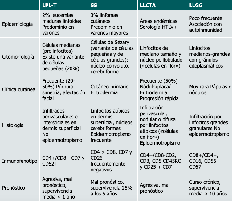 Conclusiones: La LPL-T corresponde al 2% de las leucemias linfocíticas maduras en los adultos. Entre el 20% y el 50% de los pacientes presentan afectación cutánea, con predominio en la región facial, y son característicos el eritema, la púrpura y la simetría, aunque existen manifestaciones atípicas. El diagnóstico diferencial incluye otros síndromes linfoproliferativos T con afectación cutánea y en sangre periférica, entre los que destaca el síndrome de Sézary. Los pacientes con LPL-T pueden presentar afectación cutánea en el debut o en una recidiva de la enfermedad. La piel representa un órgano accesible para la toma de muestras y para el diagnóstico y el estudio de estos pacientes.