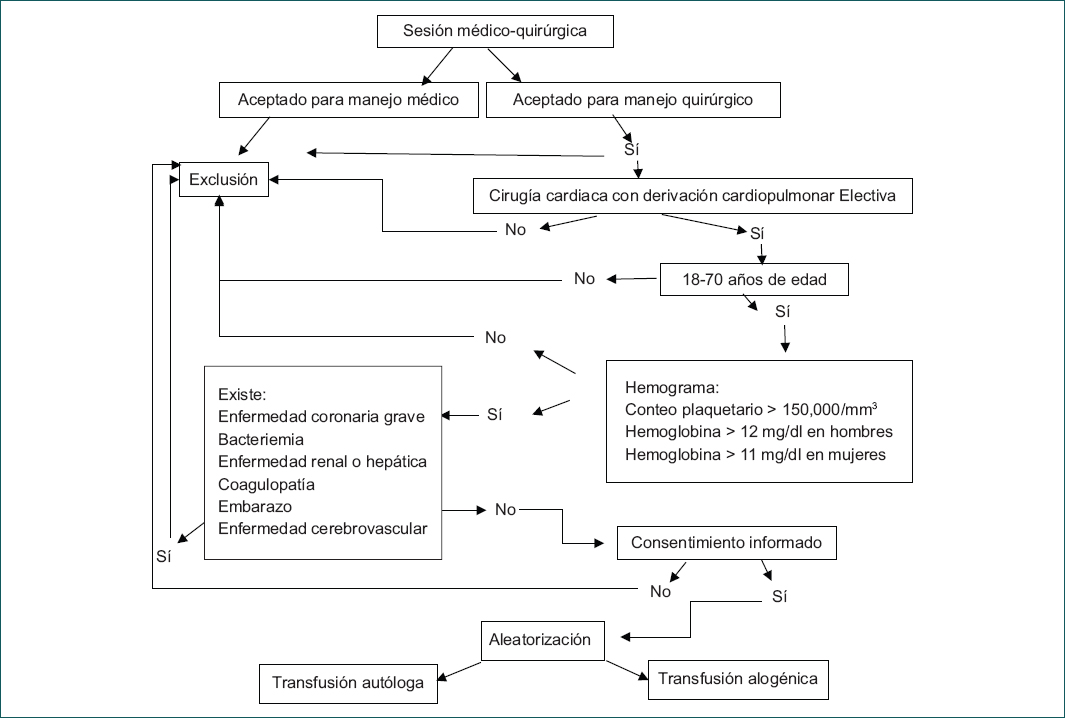 Una vez autorizado, y con la aprobación del Comité de Enseñanza, Investigación y Bioética del Hospital General Dr. Gaudencio González Garza, del Centro Médico Nacional La Raza, se obtuvo el consentimiento informado de los pacientes para dar inicio a la realización del presente estudio. Este fue un estudio experimental, prospectivo, longitudinal, comparativo sin cegado, para evaluar la transfusión autóloga frente a la transfusión alogénica en pacientes sometidos a cirugía cardiovascular.