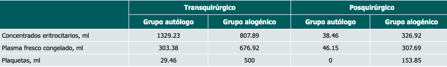 En el grupo de transfusión alogénica se transfundieron, en promedio, el equivalente a tres paquetes globulares, tres de plasma fresco congelado y una aféresis plaquetaria durante la estancia del paciente en el quirófano. En el posquirúrgico inmediato se transfundieron hasta tres paquetes globulares, con un promedio de uno y medio.