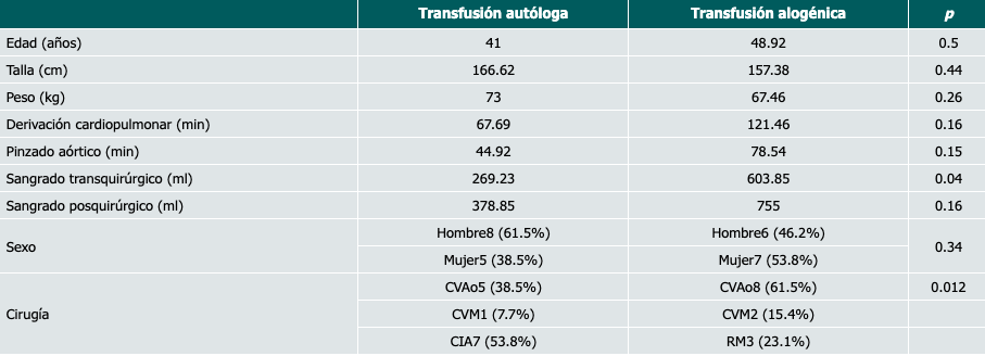 Se encontraron diferencias significativas en el sangrado transquirúrgico, mismo que está asociado al mayor tiempo quirúrgico y al tipo de cirugía realizada. Igualmente, hubo una diferencia significativa entre ambos grupos en cuanto al tipo de cirugía realizada, siendo más frecuente el cambio valvular aórtico y el cierre quirúrgico de comunicación interauricular en los pacientes con transfusión autóloga (Cuadro I).
