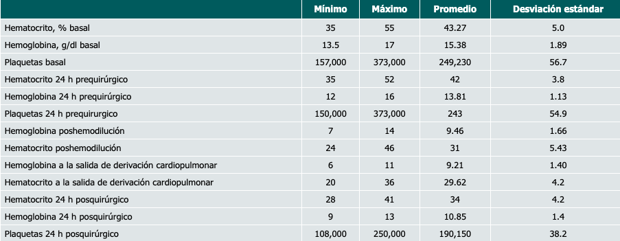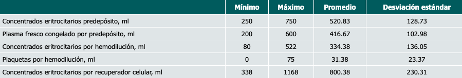 Se registró la cantidad de hemoderivados autólogos y alogénicos usados durante la cirugía, y en el primer día de posoperatorio se realizó biometría hemática de control a las 24 horas de la intervención. También se contabilizó la cantidad de sangrado en el procedimiento quirúrgico y en el primer día de posoperatorio.