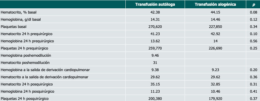 Al realizar la comparación de los resultados de la biometría hemática realizada se observó que no hay diferencia estadísticamente significativa entre ambos grupos. Cabe destacar que los pacientes del grupo de transfusión autóloga realizaron donación por predepósito y hemodilución normovolémica aguda, y a pesar de ello tuvieron unos valores de hemoglobina y de hematocrito similares a los del grupo de transfusión alogénica. En la biometría de control a las 24 horas de posoperatorio se observó un valor ligeramente superior en el grupo de transfusión autóloga, sin llegar a requerir transfusión de ningún hemoderivado alogénico. Es preciso tener en cuenta que esto se asocia a la cantidad de sangrado transquirúrgico y en el posoperatorio inmediato.