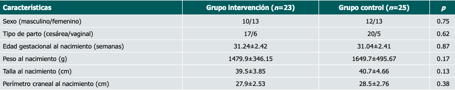 Las variables antropométricas al alta hospitalaria también fueron significativamente más altas en el grupo de intervención, en comparación con el grupo control, para la altura (p = 0.01), el peso (p < 0.001) y el perímetro craneal (p = 0.04).