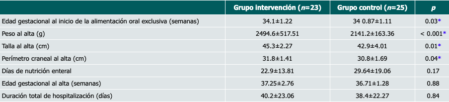 Resultados: Completaron el estudio 23 niños en el grupo de intervención y 25 en el grupo de control histórico. Los niños del grupo intervenido mostraron transición acelerada a la alimentación oral independiente y valores más elevados de altura (p = 0.01), peso (p < 0.001) y perímetro craneal (p = 0.04) en el momento del alta hospitalaria. La edad gestacional al alta y la duración total de la hospitalización no mostraron diferencias entre grupos (p > 0.05).