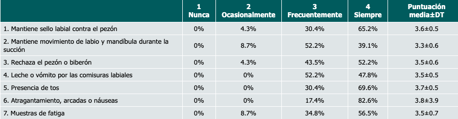 En el primer ítem se valoran la forma y el mantenimiento del sello labial contra el pezón o el biberón. El segundo observa si se mantiene el movimiento del labio y la mandíbula durante la succión. En el tercero se evalúa si escupe o rechaza el pezón o el biberón. En el cuarto se aprecia si aparece leche o vómito por las comisuras labiales. El quinto busca eventos de tos. El sexto se refiere a datos de atragantamiento, arqueo o náuseas. Y el último valora si aparecen muestras de fatiga, considerando estas cuando aparecen pausas respiratorias mayores de 15 segundos.