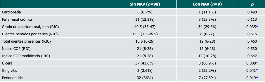 La presencia de úlceras y la enfermedad periodontal fueron las dos características del estado de salud bucal asociadas con la presentación de NAV en el análisis multivariado; a pesar de que se contó con un tamaño de muestra limitado, se obtuvo significancia estadística en estos hallazgos. Adicionalmente, se reconoció la presencia de confusión residual no medida que podría explicar las variaciones en las asociaciones aquí estudiadas. Los resultados de este estudio implican la promoción y la implementación de acciones para mantener el mejor estado de salud bucal posible, y con ello reducir el riesgo de NAV.