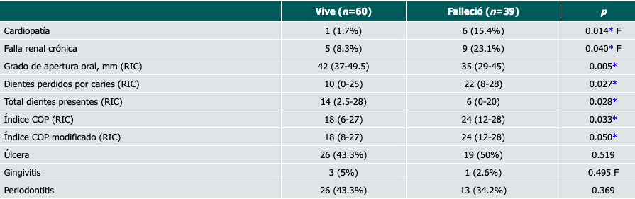 Resultados: Se incluyeron 99 pacientes con mediana de edad de 56 años; el 41.4% eran de sexo femenino. El diagnóstico de ingreso más frecuente fue trauma craneoencefálico. El 75% de la población evaluada presentó al menos 26 dientes perdidos por caries; los hallazgos más prevalentes fueron queilitis, úlceras y periodontitis. Se diagnosticaron nueve casos de neumonía (9.1%). La úlcera bucal (odds ratio ajustada [ORa] = 14.3; intervalo de confianza del 95% [IC95%]: 1.5-137), la periodontitis (ORa = 5,4; IC95%: 1.0-28.1) y la enfermedad renal crónica (ORa = 10; IC95%: 1.4-71-7) derivaron de neumonía asociada a ventilador, mientras que la apertura bucal ≤ 35 mm (OR cruda = 5.3; IC95% = 2.1-13.5) presentó asociación no ajustada con la mortalidad intrahospitalaria.