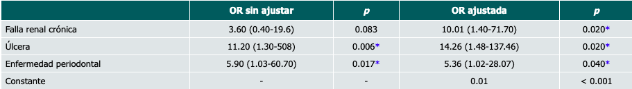 Con las variables que se mantuvieron bajo el punto de corte de significancia estadística se construyó el modelo de regresión logística múltiple para NAV, en el que se encontró una asociación estadísticamente significativa luego del ajuste con el antecedente de enfermedad renal y con la presencia de úlceras y de enfermedad periodontal; los resultados se presentan en el cuadro III. Cabe decir que el modelo de mortalidad solo mostró asociación estadística con la apertura bucal ≤ 35 mm (odds ratio cruda = 5.3; intervalo de confianza del 95% [IC95%]: 2.1-13.5), pero esta asociación se perdió luego del ajuste.